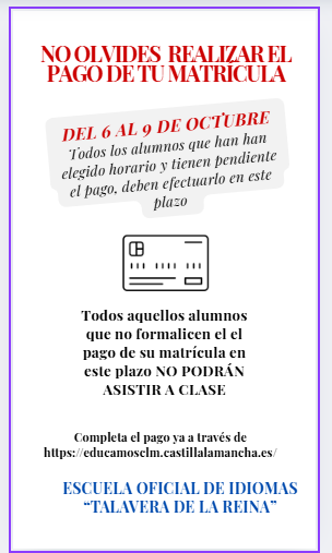 Todos los alumnos que tienen pendiente realizar el pago, deben efectuarlo en el plazo del 6 al 9 de octubre. En caso de no formalizar el pago de su matrícula, no podrán asistir a clase.